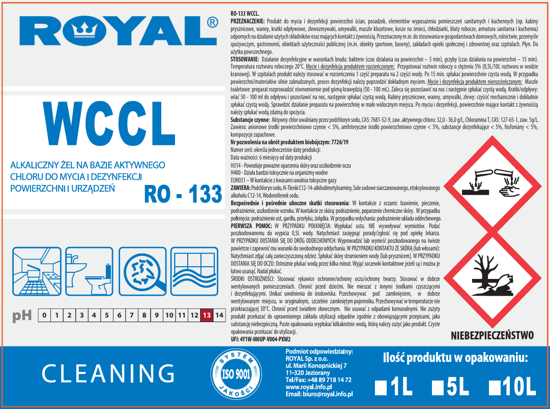 Aktywny chlor uwalniany przez podchloryn sodu, CAS: 7681-52-9, zaw. aktywnego chloru: 32,0 – 36,0 g/L, Chloramina T, CAS: 127-65-1, zaw. 5g/L.